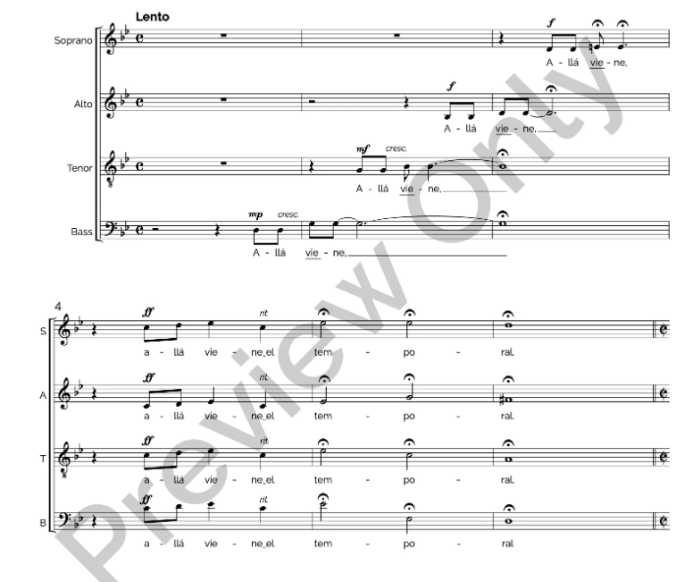 Temporal is a traditional plena from Puerto Rico. Plena is an Afro-Puerto Rican rhythm that blends melodic and rhythmic elements from Spanish and African musical influences. Diana Sáez captures the essence of the plena in this authentic and accessible choral arrangement and Suzzette Ortiz compliments the music with Afro-Caribbean rhythmic flavors in the piano accompaniment.