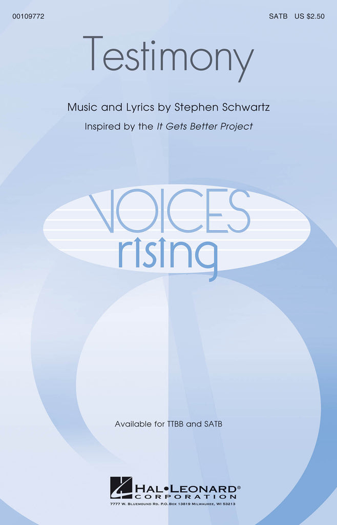 This is a breathtaking and emotional new work composed by Stephen Schwartz for the San Francisco Gay Men's Chorus, conducted by Timothy Seelig. Inspired by the heartfelt words of the It Gets Better Project, “Testimony” speaks to anyone who has ever felt out of place. A powerful work of affirmation and inclusion! Also available for TTBB (set in different key). Duration: ca. 7:30.