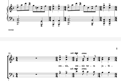 Here's an impressive Latin festival work from composer Ruth Morris Gray. Her joyfully rhythmic setting uses full stacked harmonies in energized mixed meter to build excitement in this minor-key thriller. Contrasting lyrical sections include some English lyrics, and percussive handclaps reflect the "trees will clap their hands" text. A strong standout for concert or contest.