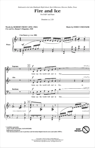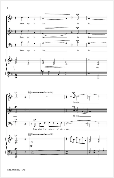 This poem by Robert Frost reflects on the end of the world, musing whether it might be consumed in fire or ice, and comparing the two elements with the emotions of desire and hate. The composer's music captures the contrast of these elements and offers the singers a chance to experience these important musical concepts.