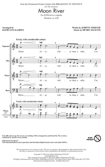 Winning an Academy Award for Best Original Song as well as a Grammy for the Song of the Year, Moon River has become a timeless classic since its appearance in the 1962 film “Breakfast at Tiffany's.” This masterful arrangement by David von Kampen is a rich tapestry or lush harmony and emotional depth.