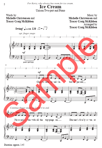 With a charming swing feel and a jazzy accompaniment track, this piece will have all of your singers screaming for ice cream! Written for two-part or unison choirs, this is a short, easy-to-learn, and entertaining selection for your program with young singers.