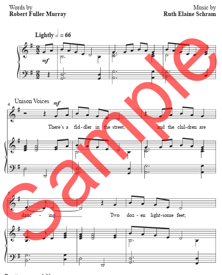 Ruth Elaine Schram’s choral setting of Robert Fuller Murray’s poem “The Fiddler” is an upbeat celebration of music and joy. With a lilting rhythm and vibrant harmonies, the piece brings the poem’s whimsical imagery to life, capturing the infectious energy of a fiddler playing with uncontainable enthusiasm. With an optional violin part that enhances the festive mood, this piece invites both singers and listeners to revel in the playful, toe-tapping music, evoking the image of a fiddler whose tunes stir hearts and lift spirits.