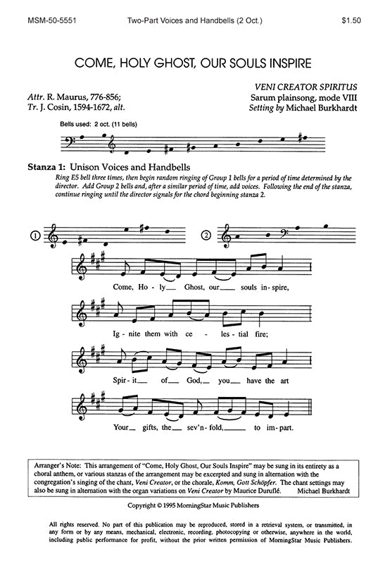 Mystical/ethereal effect with random ringing of chant VENI CREATOR SPIRITUS. New treatment each stanza. Voices unison, organum (5ths) and canon. Variety of uses. Suitable for all. Two-Part Voices and Handbells play from score (2 octaves). Part of the Mich