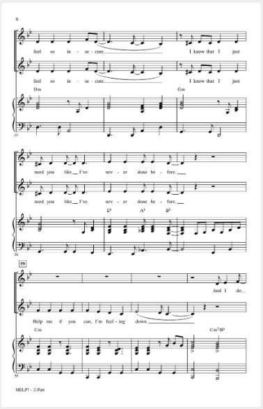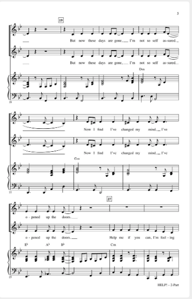 Made famous by the English rock group, the Beatles, “Help!” reflects the beginning of artistic recognition for the group from mainstream critics. Choirs will love the song's energetic spirit from start to finish!