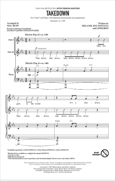 In KPop Demon Hunters, music is more than performance--it's power. “Takedown” drives that message home with fierce rhythms and unstoppable energy as the heroines battle dark forces with the strength of music itself. This arrangement brings the cinematic drama and cultural impact straight to your stage.