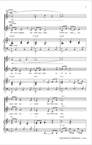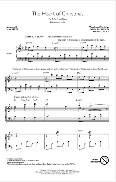 “The Heart of Christmas,” from “North Pole Musical,” captures the love and joy of the holiday season and reminds us that Christmas is about miracles of the heart. Comfortable vocal ranges and recurring melodic themes make the piece easy to learn from start to finish. An optional narration at the song's beginning poignantly highlights the spirit and message of the song.