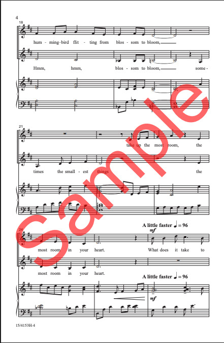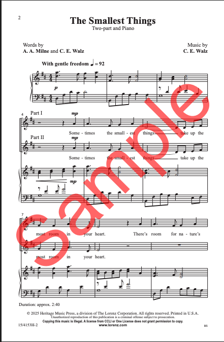 C.E. Walz's "The Smallest Things," set to the words of A. A. Milne, is a tender, lyrical reflection on the beauty found in life’s smallest wonders. From the glow of a firefly to the flight of a hummingbird, the piece highlights how nature’s tiniest marvels can hold deep significance in our hearts. With its gentle, flowing melody, this piece invites reflection on the joy hidden in fleeting moments, reminding us that sometimes the smallest things take up the most room in our hearts.