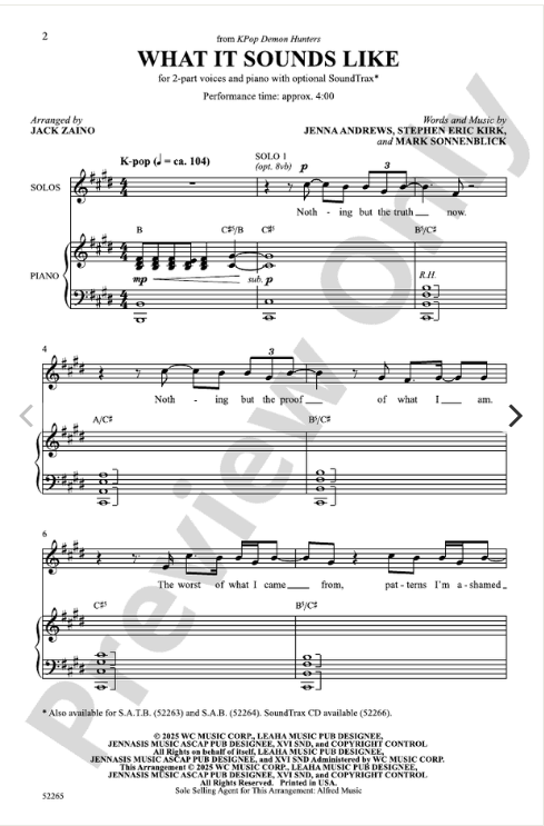 Here's a high-power knockout from KPop Demon Hunters. Highlighting three soloists that combine for a brief triadic trio, this epic anthem explores themes of self-acceptance, authenticity, and perseverance. At a pivotal moment, the inspirational chorus unfolds into a powerful interlude that references another Kpop hit, "Golden." Memorable on its own or when programmed with other KPDH songs.