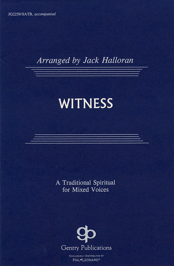 “Witness” was first released in an a cappella setting for 8-part mixed voices, and within months had sold over 30,000 copies. The following year it topped 50,000 and continued to climb. Today it remains a top seller and an industry standard. Veteran arranger Dick Bolks has masterfully revoiced and edited Mr. Halloran's setting into a solid SATB edition with optional accompaniment. Suddenly, one of the best chorals from the 20th century is available to smaller sized choirs...and Mr. Halloran's integrity remains thoroughly intact. Thanks, Dick. Available: SATB accompanied, SATB divisi a cappella.